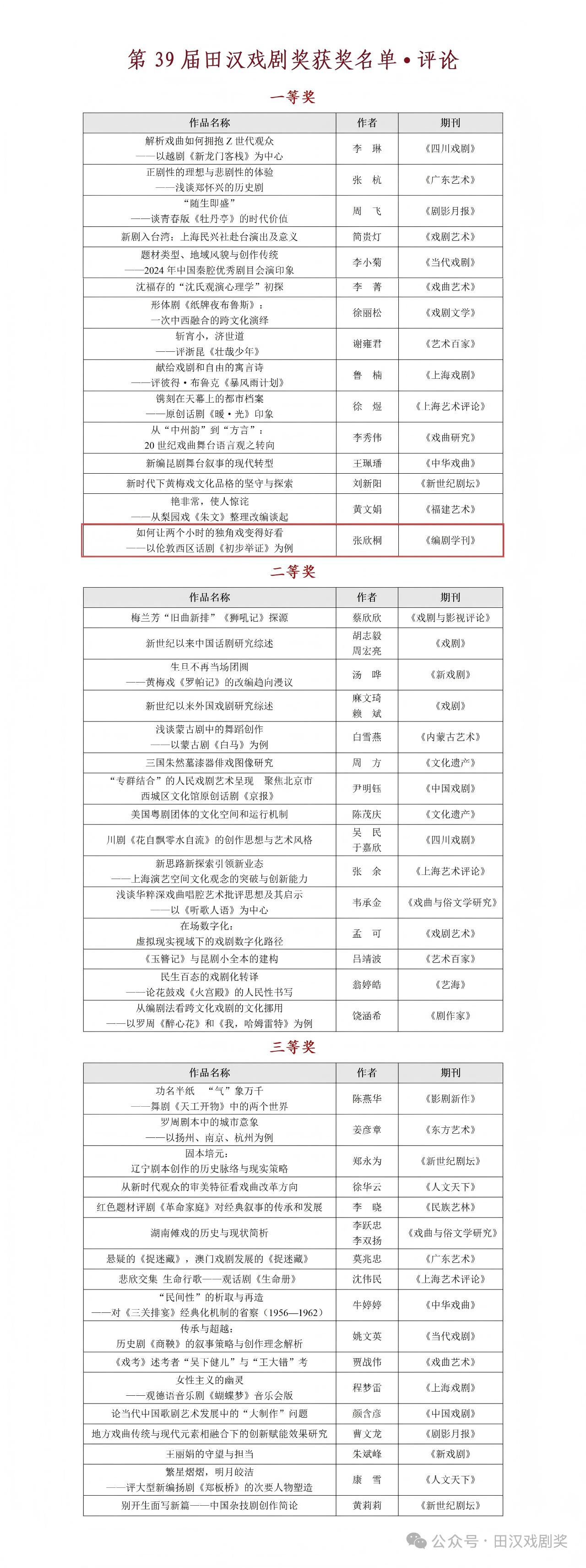 本届共有32家期刊报送的134篇(部)作品参评,各期刊代表现场介绍了报送作品的主要内容、学术价值与亮点,评委遵循评选规则,分类别依次对各期刊初评报送作品进行评审,并通过网络投票程序现场进行无记名投票,评选出第39届田汉戏剧奖剧目、评论、理论、剧本四类奖项。